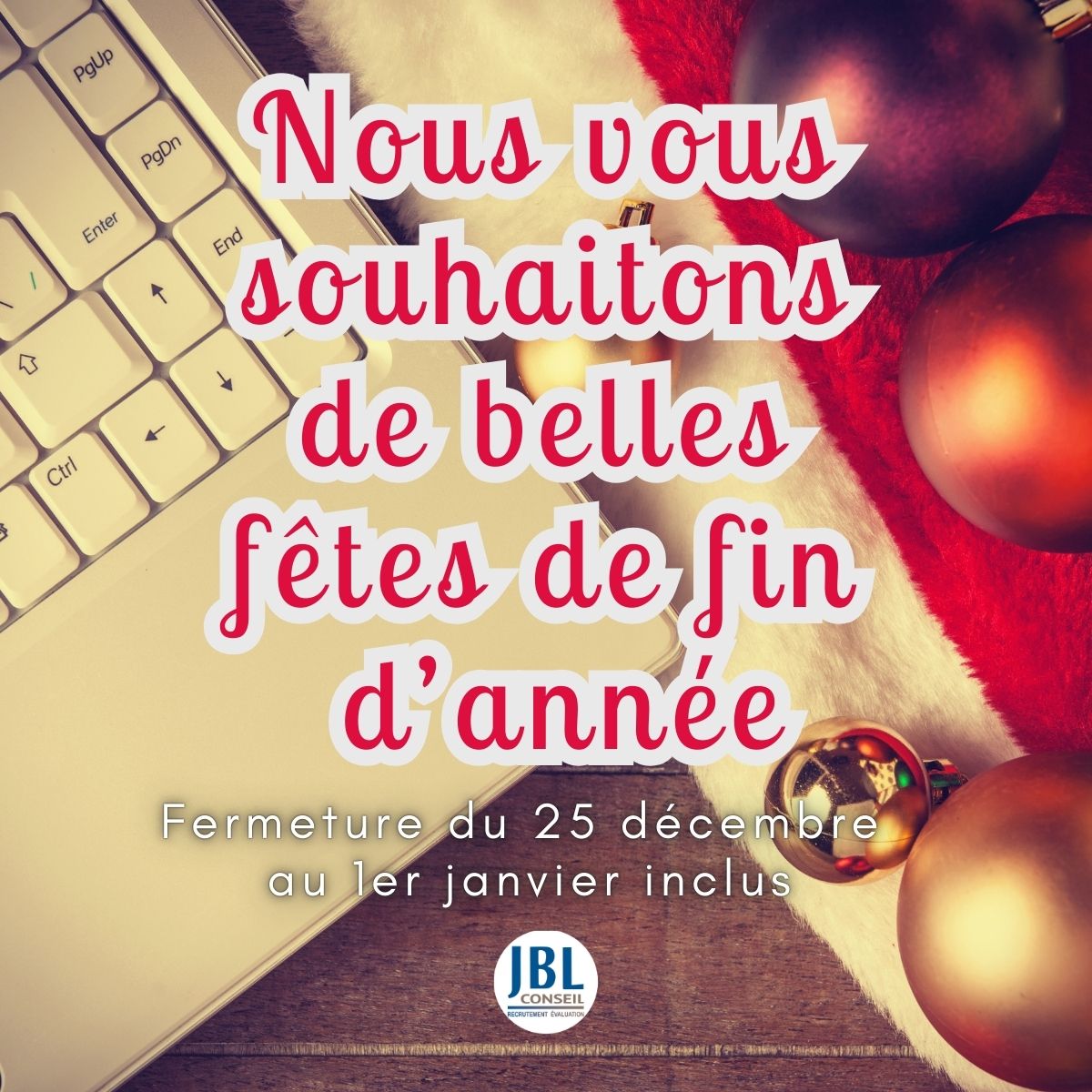 Le cabinet JBL Conseil sera fermé du 25 décembre au 1er janvier inclus pour permettre à toute l’équipe de profiter des fêtes de fin d’année en famille et de se ressourcer avant de démarrer 2025 avec énergie. 🎄✨