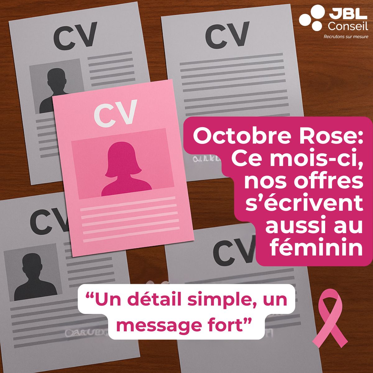 C’est pourquoi, tout au long du mois d’octobre, nous avons choisi de donner un sens particulier à nos annonces en les rédigeant au féminin (F/H). Ce geste symbolique est notre manière d’associer notre métier à la cause d’Octobre Rose : rappeler que derrière chaque intitulé de poste, il y a des femmes qui peuvent, elles aussi, se projeter, candidater et réussir.